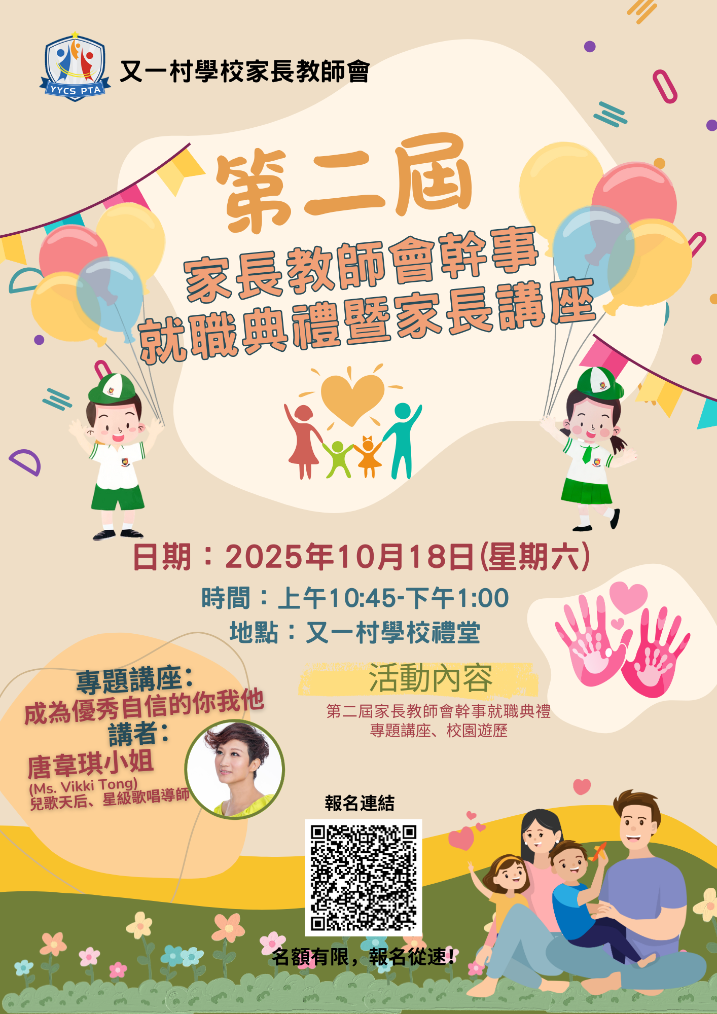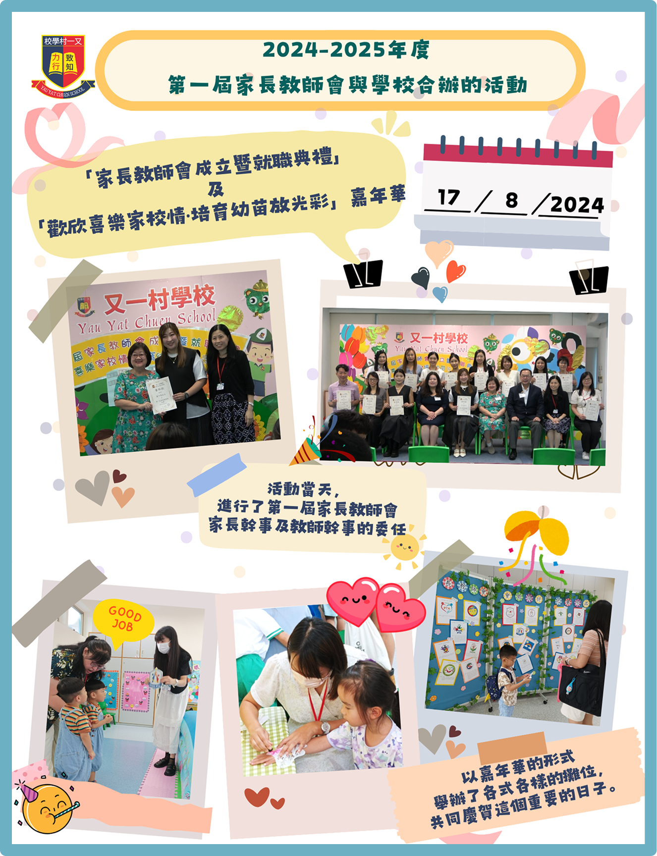 又一村學校家長教師會,於2024年8月17日成立,我們一眾幹事也相信成立家長教師會能增加家長之間溝通、聯繫、建立家長網絡,發揮家長潛能,且能凝聚家長的力量,提升家長對學校的歸屬感。此外,家長教師會提供一個平台讓家長參與學校的活動、分享經驗。從中讓家長、學生和教師共同創造不同的學校體驗。